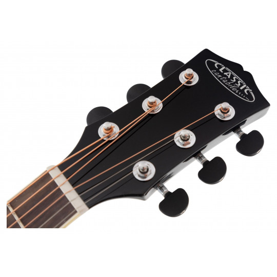 Elektroakustická kytara typu dreadnought leském černém provedení s přední deskou ze smrkového dřeva a zadní deskou a luby z Mahagonu Sapele. Krk je vyroben z javoru. Šířka těla 40 cm, šířka nultého pražce 43 mm. Nechybí olejová mechanika, perleťové vložky, hardware v provedení chrom nebo vestavěný předzesilovač s 3-pásmovým ekvalizérem a LED kontrolkou stavu baterie. Tato kytara kombinuje elegantní design s kvalitním zpracováním a může být Vaše za přijatelnou cenu.