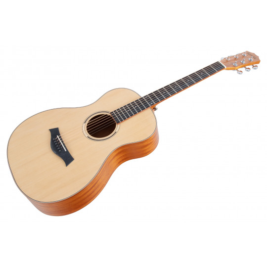 Akustická kytara 3/4 velikosti typu folk v provedení natural open pore s přední deskou ze smrku a zadní deskou a luby z mahagonu, krk je vyroben z okoumé.