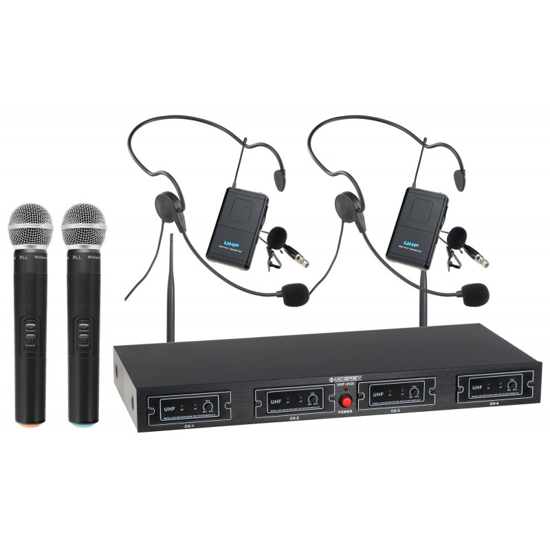 4-kanálový přijímač UHF. 2 dynamické ruční mikrofony, 2 kompaktní bezdrátové bodypackové vysílače se sponou na opasek, 2 náhlavní soupravy a 2 klopové mikrfony. Dosah 50 metrů, provozní doba cca 8 hodin.