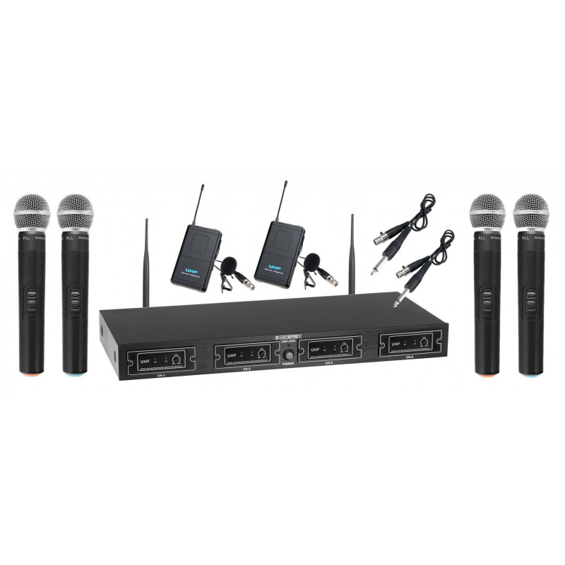 4-kanálový bezdrátový mikrofon UHF se čtyřmi dynamickými ručními mikrofony a dvěma klopovými mikrofony, kompaktní bezdrátový vysílač bodypack se sponou na opasek. Dosah 50 metrů, provozní doba asi 8 hodin, uživatelsky přívětivý design a provoz. Včetně 2 kytarových kabelů. Dvě nastavitelné tyčové antény, rádiové frekvence: 863,500 MHz / 864,825 MHz / 824,550 MHz / 828,175 MHz