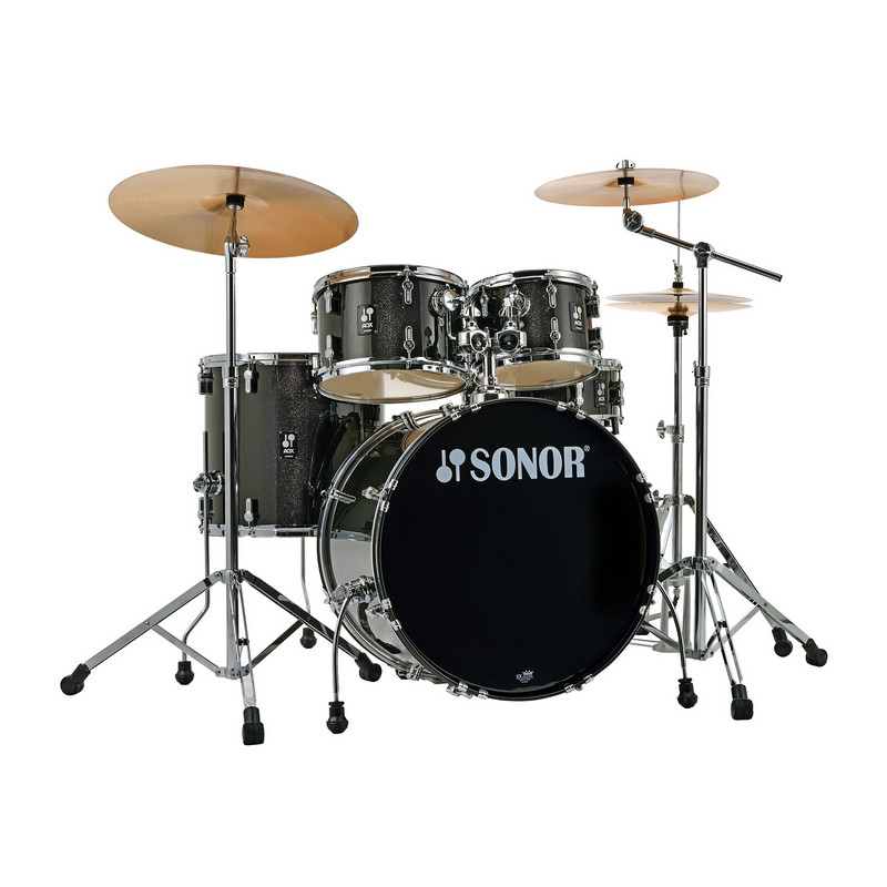 Bicí set ze série AQ X stage v barvě Black Midnight Sparkle, korpusy z topolu s povrchovou úpravou fólie, chromovaný hardware. Součástí setu je sada hardware HS 1000 a set činelů Sonor CAST B8.