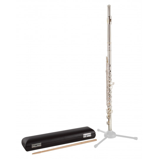 Příčná flétná 3 dílná s uzavřenými klapkami vyrobená postříbřeného niklu a dodávaná včetně vytěráku, pouzdra a transportní tašky.