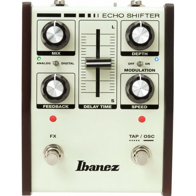 Pedálový efekt Ibanez Echo Schifter (ES3) je všestranný delay efekt s možností přidání modulace, který jistě osloví nejednoho milovníka pěkných kytarových ploch. Nabízí možnost volby mezi čistě analogovým a digitálním delayem (delay time analog 40 – 600ms, digital 40 -1500ms) a zvýraznění zvuku delaye přepínatelnou efektovou modulací. Pět hlavních ovladačů nabízí široké možnosti zvukových nastavení delay efektu a charakteru efektové modulace. Footswitch s označením FX slouží k zapínání/vypínání efektu, druhým footswitchem TAP/OSC ovládáte funkci Tap Tempo, případně přidržením přepínače necháte delay efekt oscilovat. Díky přepínači Inst/Line využijete služeb tohoto pedálu i u nástrojů s linkovou úrovní signálu (klávesy, syntezátory apod.).