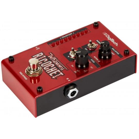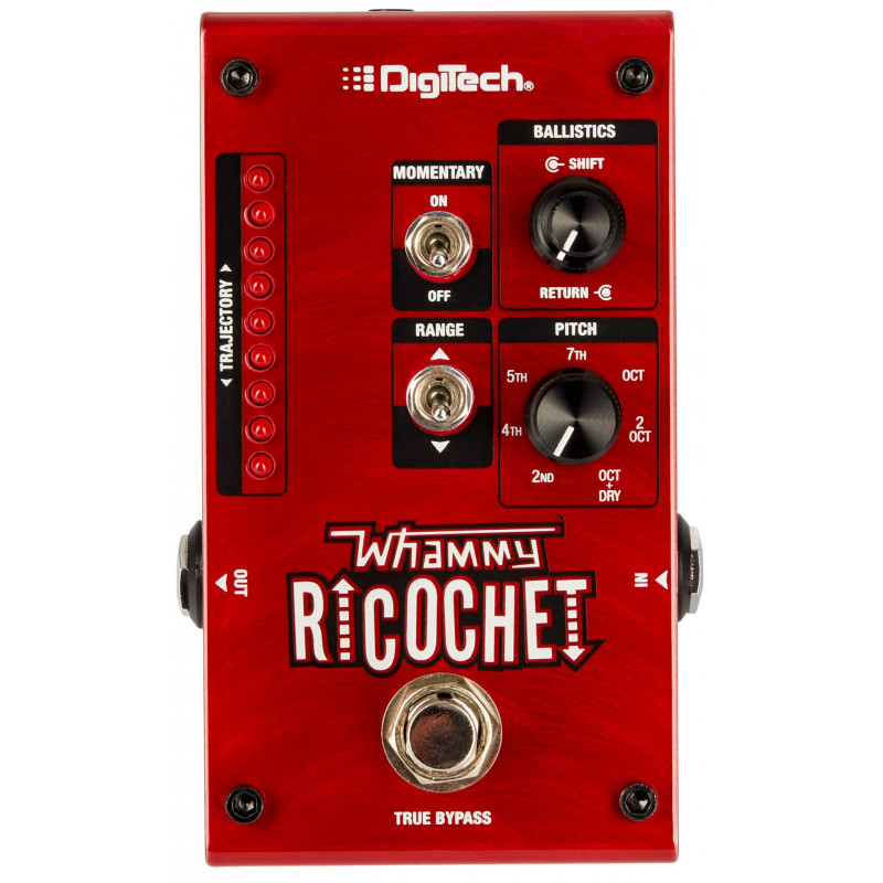 Digitech Whammy Ricochet je skladnější a úspornější verzí populárního modulačního efektu. V tomto provedení se jedná čistě o pitch-shifter se dvěma přepínatelnými mody Classic a Chords, kdy tak můžete ohýbat jednotlivé noty nebo zvuk celých akordů. Expression pedál v případě kompaktní krabičky Whammy Ricochet nahrazují ovladače a jejich nastavení, kterým určíte podobu pitch-shifting efektu. Knob Pitch nastavuje interval pitch-shift efektu (2nd, 4th, 5th, 7th, Octave, 2 Octaves, Octave + Dry), Range směr ohýbání noty/akordu, ovladač Shift určuje rychlost ohnutí noty na nastavený interval po aktivaci efektu, Return naopak změny na původní výšku tónu po vypnutí/bypassování efektu. O průběhu a rychlosti efektové modulace informují červené LED diody. Switchem Momentary lze přepínat mezi klasickým latching modem pedálu a momentary, kdy je pitch-shifting efekt aktivní pouze po dobu sešlápnutí footswitche. Efekt je zapojen jako true bypass. K napájení slouží přibalený adaptér.