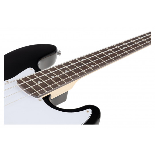 Elektrická baskytara typu Jazz Bass v černé barvě a lesklé úpravě, tělo lípa, krk javor, hmatník palisandr, menzura 864 mm, nultý pražec 42 mm, snímače S-S, hardware chrom, ovládání 2x volume, 1x tone.