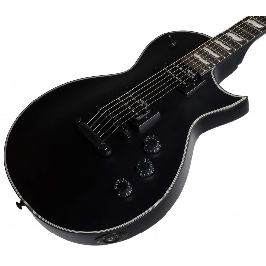 Elektrická kytara typu single cut v černé barvě, tělo mahagon, krk mahagon, hmatník jatoba, 22 pražců, menzura 629 mm, pevná kobylka, konfigurace snímačů H-H, 3polohový přepínač.