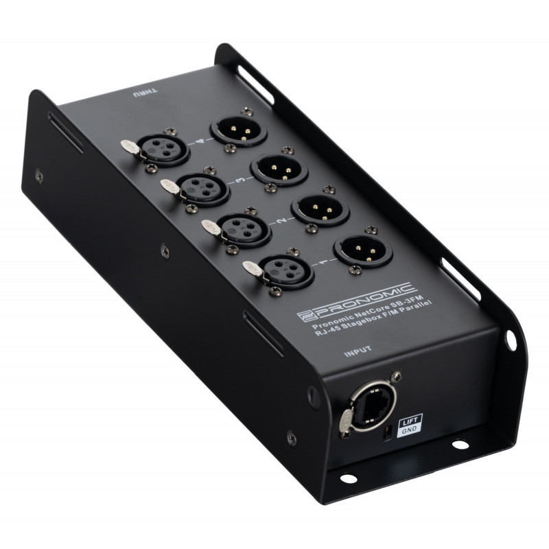 Stagebox se 4 vstupy XLR (samec) a 4 XLR (samice) a 2x zásuvkou RJ45 pro přenos analogových nebo digitálních signálů síťovými kabely, komponenty systému lze libovolně kombinovat. Provoz je možný pouze se stíněnými kabely Cat5.