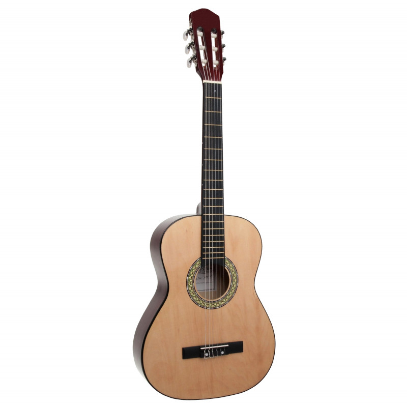 Klasická kytara velikosti 3/4 s vrchní deskou, zády a luby vyrobenými z lípy a hmatníkem z palisandru. Vhodné pro začínající kytaristy. Menzura 590 mm.