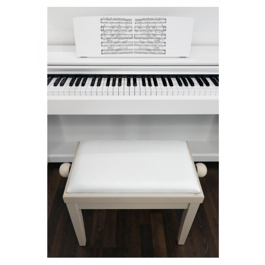 Klavírní stolička v provedení bílý krémový mat. Rozměr sedací plochy: 55 x 32cm, nastavitelná výška: 47 - 56 cm, jednoduchý skládací systém (nůžky), gumové protiskluzové podložky na nohách, součástí je nářadí na sestavení židle.
