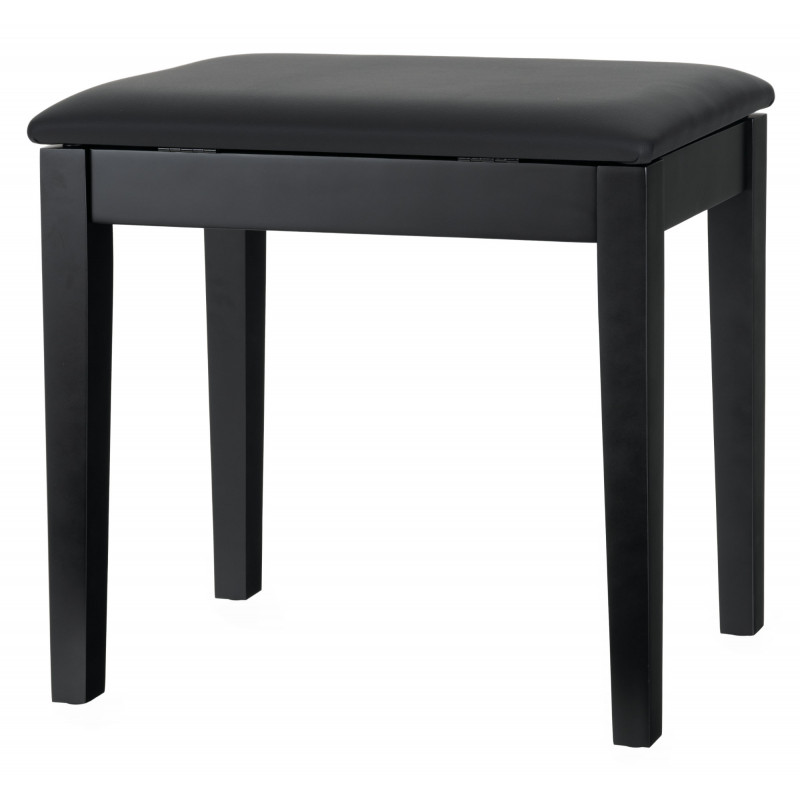 Klavírní stolička s praktickým úložným prostorem v matném černém provedení s černým koženkovým sedákem. Rozměry sedáku jsou 53 x 33 cm. Stolička má pevnou dřevěnou konstrukci.