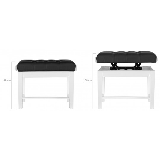 Klavírní stolička s vysokým polstrováním v lesklém bílém provedení, velmi stabilní a pohodlná se vzpěrami a černým čalouněným sedákem z umělé kůže v stylu Chesterfield. Stolička je výškově nastavitelná v rozmezí od 48,5 - 56 cm. Stolička má hladký chod, 4 násobný křížový mechanismus a odolnou dřevěnou konstrukci, která umožňuje zatížení až 200 kg. Gumové nožky na spodní straně chrání podlahu před náhodným poškrábáním.
