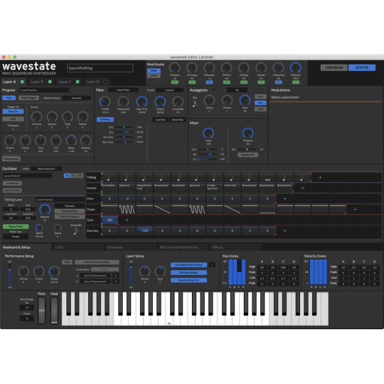 Editor/Librarian funguje jako druhý čelní panel pro wavestate. Zobrazení modulovaných hodnot parametrů a vlnových sekvencí v reálném čase vám poskytuje okamžitou zpětnou vazbu s vašimi výtvory. Kopírujte a vkládejte zvuky, obálky, LFO, nastavení filtrů a další. Ponořte se do hloubky efektů s přístupem ke všem interním parametrům a vytvářejte vlastní efektové presety.