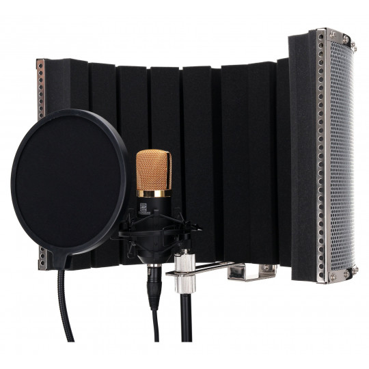 Studio set s velkomembránovým mikrofonem 1,25", kardioidní směrová charakteristika, frekvenční rozsah 20-20000 Hz, vyžaduje fantomové napájení 48 V. Včetně mikrofonního pavouka, akustického ošetření - absorber a přepravního kufru. Součástí stojan, nylový popfiltr i kabel.