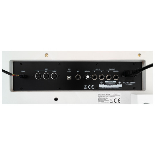 Digitální piano "křídlo", bílé, vysoký lesk, 88 kláves s kladívkovou mechanikou, trojitý senzor, syntetická slonovina, 5-násobný multisampling, polyfonie 256 hlasů, 1200 zvuků, 270 doprovodů, 90 demo skladeb, 38 DSP efektů, nahrávání do MP3 a MIDI, USB to Host, USB to Device, AUX vstup a výstup, 2x sluchátkový výstup, reproduktory 2x 40W (woofer) a 2x 20W (tweeter), 3 pedály.