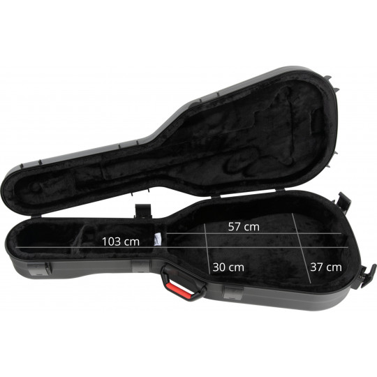 Díky robustní polypropylenové konstrukci nabízí spolehlivou ochranu před nárazy a pády. 6 zaklapávacích zámků zajišťuje bezpečné utěsnění a zabraňuje náhodnému otevření. Interiér je vystlán černým plyšem, který jemně pohladí vaši klasickou kytaru velikosti 4/4 a ochrání ji před poškrábáním. Navíc má praktickou vnitřní přihrádku, do které můžete bezpečně uložit příslušenství, jako jsou struny, trsátka a ladičky.