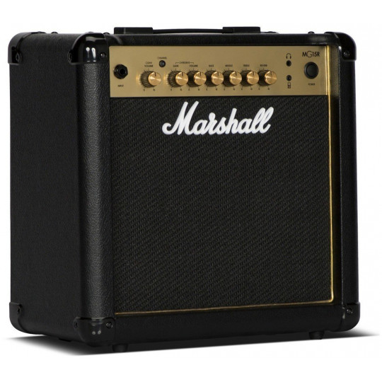 Transistorové kombo MG15R řady Marshall MG Gold představuje dobrý kompromis mezi malým přenosným aparátem a kombem, které v klidu použijete v zkušebně nebo menším klubu. Tento model je vybaven 8“ reproduktorem a zesilovačem o výkonu 15W. Díky své nízké hmotnosti a malým rozměrům je toto kombo ideální pro hraní v menších klubech a jiných akcích. K dispozici jsou 2 kanály – clean a overdrive, kompletní kontrolu frekvenčního pásma umožňují korekce basů, středů i výšek.
