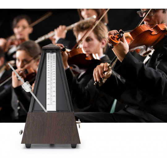 Mechanický metronom v hnědém provedení s kresbou dřeva, nastavitelným tempem (40-208 úderů za minutu) i taktem a hlasitým, jasným zvukem.