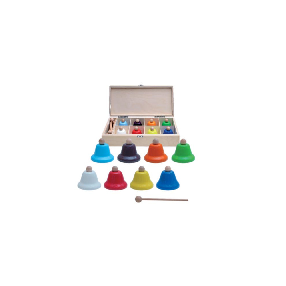 Sada 8 barevných zvonků s dřevěným držadlem s tónovým rozsahem c3 – c4 v dřevěném boxu. Každá barva má své ladění, včetně 8 dřevěných paliček. Vyrobeno v Německu.