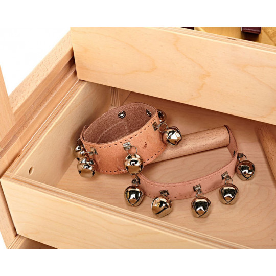Sada perkusních nástrojů v dřevěném vozíku, sortiment 2 obsahuje 61 ks perkusních nástrojů pro skupinu až 30-ti muzikantů. Součástí je vozík z bukového dřeva s kolečky a 3 šuplíky