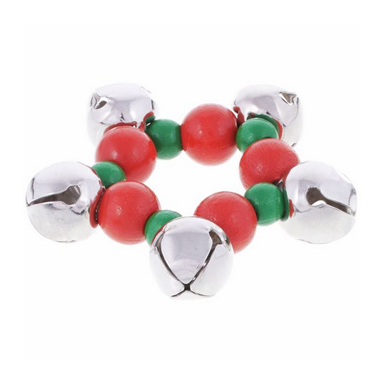 Náramek na zápěstí tvořený pěti středně velkými rolničkami a dřevěnými kuličkami v zelené a červené barvě. Vhodné pro děti od jednoho roku.