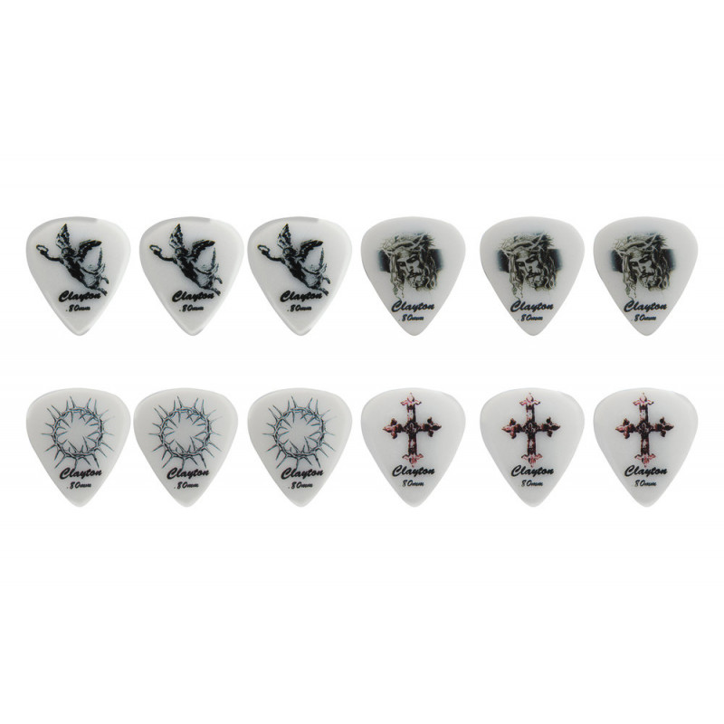 Kytarové trsátko; speciální plast, relativně tuhé trsátko, s matným povrchem; 4 křesťanské motivy ( Trnová korunka, Kříž, Ježíš na kříži ), ve 4 různých sílách; Standard 351 tvar; údaj o ceně uveden vždy pro jedno trsátko;