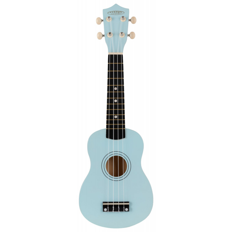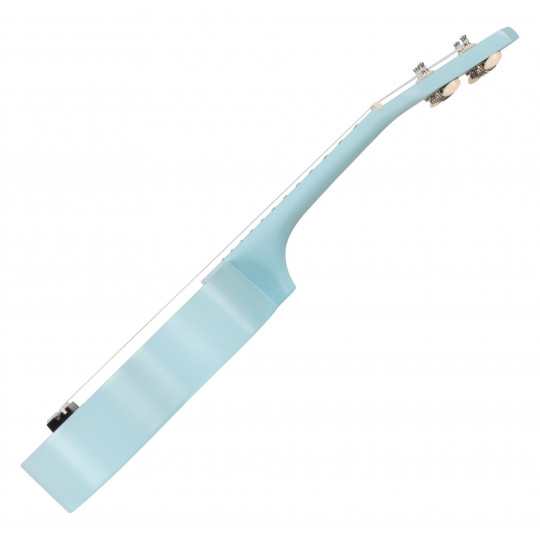 Sopránové ukulele s 12 pražci, otevřenými kytarovými mechanikami v modrém provedení, cenově dostupné. Orientační tečky na 5., 7. a 10. pražci.