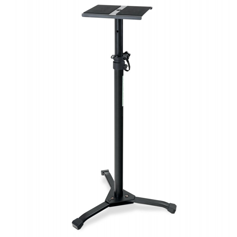 Robustní reproduktorový stojan pro studiové monitory v černé barvě. Skládací nohy pro snadnou přepravu, nastavitelná výška od 75 cm do 130 cm, úložný prostor s pásy z pěnové gumy pro monitory nebo hi-fi reproduktory.