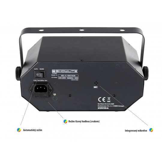 Napájení MEL-4 je možné přes síťový kabel s vhodnou EU zástrčkou. Vypínač v klasickém slova smyslu není nutný, multiefektové světlo se spustí ihned po připojení ke zdroji energie. Přepínačem na zadní straně přístroje se ovládá režim zvolených světelných efektů, ať už automatický nebo řízený zvukem. Ventilátorem chlazená multifunkční efektová jednotka může být použita mnoha způsoby k vytvoření kouzelné, slavnostní atmosféry. Od trvalé instalace, například v divadle, přes zavěšení do společenské místnosti nebo zahradního domku až po jednoduché umístění na stůl nebo polici, například v pokoji pro mládež nebo v obývacím pokoji, vše je možné. S uzamykatelným montážním držákem jej lze také připevnit na zeď nebo strop a osvětlit sklepní bar, garáž nebo jakékoli jiné místo konání akce dle vašeho výběru. Zejména v kombinaci s mlhostrojem vytváří magické efekty.