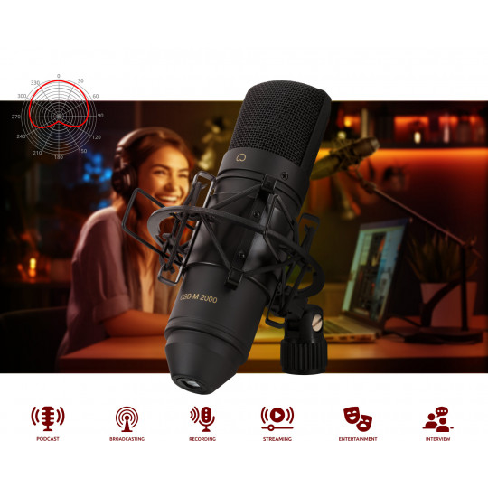 USB kondenzátorový mikrofon, ideální pro podcast a mluvené slovo, kardioida, 16 bit / 48 kHz, frekvenční odezva 20Hz-18kHz, citlivost -34 dB, SPL 132 dB, S/N ratio 78 dB, Plug&Play, kompatibilní se všemi DAW, integrované USB audio rozhraní, součástí stojánek, pavouk, USB kabel.